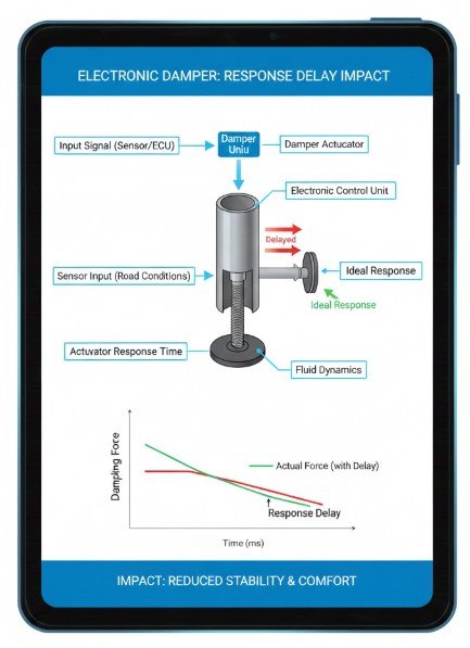 본 글은 전자식 댐퍼에 사용되는 솔레노이드 밸브의 응답 지연이 노면 요철 추종성에 미치는 영향을 분석한다. 밸브 구동 특성, 감쇠력 제어 지연, 차체 거동 변화 관점에서 전자식 댐퍼 시스템의 한계와 설계 고려사항을 정리한다. 전자식 댐퍼 시스템의 기본 개념 전자식 댐퍼는 주행 조건에 따라 감쇠력을 능동적으로 제어하는 현가 장치이다. 기존의 수동식 댐퍼와 달리, 전자식 댐퍼는 센서 입력과 … 더 읽기